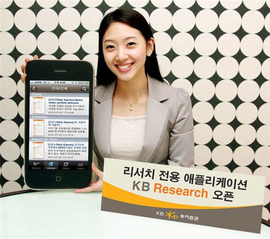 23일 KB투자증권(대표 노치용)은 업계 최초로 리서치센터의 리포트를 실시간으로 확인할 수 있는 아이폰용 애플리케이션 'KB Research'를 오픈했다고 밝혔다.