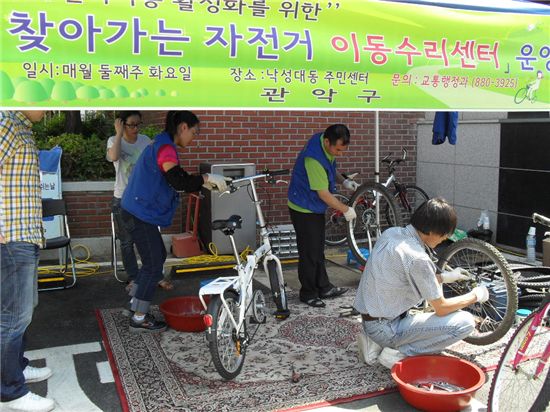 구는 자전거수리 기술자격을 취득한 서울관악지역자활센터 소속 기술자 4명으로 '찾아가는 자전거 이동수리센터'를 구성하고 지난 7월 13일부터 낙성대동을 서비스를 시작했다.