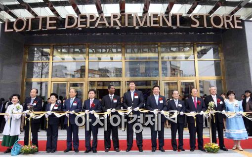 [아시아경제 이재문 기자]국내최초 시사이드(sea-side) 백화점으로 오픈 당일 매출 최고기록(67억 3천만원)을 한 롯데백화점 광복점이 지난해 12월 본관 오픈에 이어 신관격인 ‘아쿠아몰’이 25일 개장했다. 이날 신동빈(오른쪽 다섯 번째부터) 롯데 그룹 부회장, 이대호 롯데 자이언트 선수, 로이스터 롯데 자이언트 감독, 허남식 부산시장, 이철우 롯데백화점 대표이사를 비롯한 참석자들이 테이프 커팅을 하고 있다.
