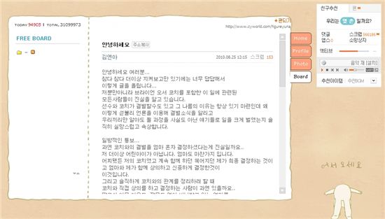 김연아는 25일 낮 자신의 미니홈피 게시판에 장문의 글을 올렸다. 이날 새벽 트위터에 "거짓말 그만 하세요"라는 멘션을 올려 큰 파장이 일어난 뒤 7시간 만이다.