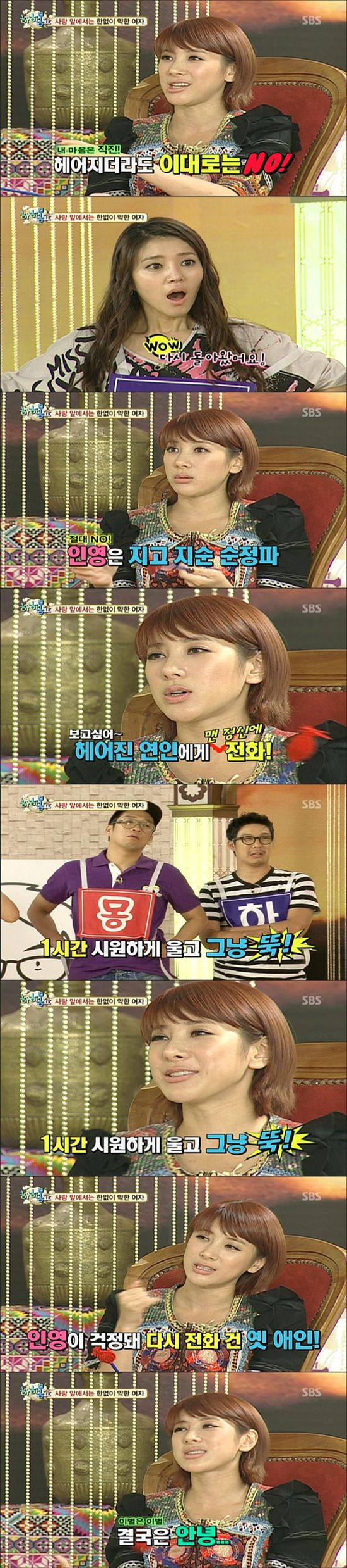 이어 서인영은 “한번은 헤어진 연인에게 전화를 했다. 그에게 아무 말도 하지 말라고 말한 뒤 1시간 동안 시원하게 울음을 터뜨린 뒤 그냥 뚝 끊었다”며 “다음날 남자친구는 내가 걱정돼 전화했지만 난 아무렇지 않은 듯 쿨하게 대처했다”며 사랑에 약한 모습을 공개했다.