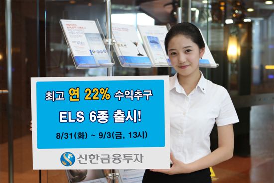[아시아경제 김은별 기자]신한금융투자는 오는 31일부터 3일까지 최고 연 10.40%~22.0%를 추구하는 ELS 6종을 공모한다. 이번에 공모하는 ELS는 원금보장형 2개, 원금 비보장형 4개다.