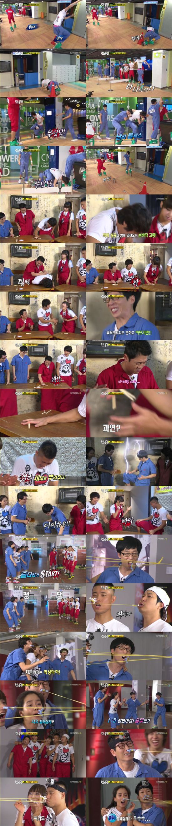 이날 레드팀(유재석, 지석진, 이광수, 송지효, 이준)과 블루팀(김종국, 박준규, 빅토리아, 개리, 하하)으로 나뉘어 게임을 펼치게 됐다. 본격적인 게임에 앞서 몸 풀기로 개리가 자신의 장점이 ‘인내심’이라고 말하면서 나무젓가락으로 딱밤 맞기를 했다. 유재석, 지석진, 박준규, 김종국 등은 나무젓가락을 머리에 맞고 눈물을 참아야했다.