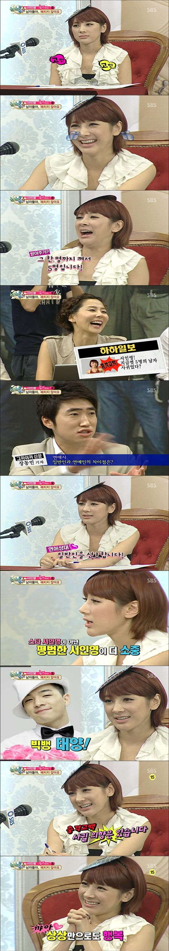 이어 “거꾸로 대시하면 사귀어 볼 의향이 있는 연예인은 누구냐”는 질문에 “빅뱅의 태양”이라며 수줍어했다. 더욱이 얼마 전 서인영이 출연중인 SBS ‘영웅호걸’에서 태양이 출연, 여자 럭비 팀을 응원하며 서인영에게 퍼포먼스를 잠시 선보인 적이 있는 터라 더욱 주목받았다.
