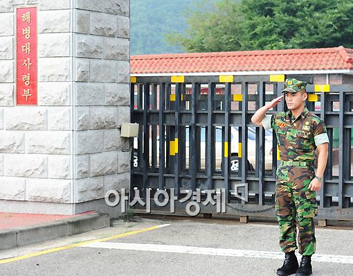 [화성(경기)=아시아경제 한윤종 기자]가수 이정(본명 이정희)이 2년간의 군 생활을 마치고 31일 오전 경기도 화성 발안에 위치한 해병대사령부에서 전역후 취재진들과의 만남에서 거수경례를 하고 있다.