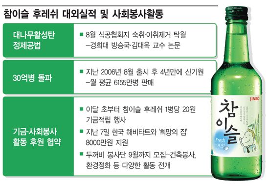 이 제품의 누계판매량이 최근 30억병을 돌파한 것으로 집계됐기 때문이다. 진로는 참이슬 후레쉬의 이같은 약진을 발판삼아 기금적립, 불우이웃돕기 등 다양한 봉사활동을 진행 또는 계획중이다.