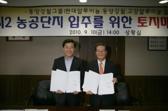 동양강철그룹은 심현영 현대알루미늄(주) 명예회장 등 7명의 임직원들이 참석한 가운데 지난 10일 논산시청 상황실에서 양지2 농공단지 입주를 위한 땅매매계약을 맺었다.