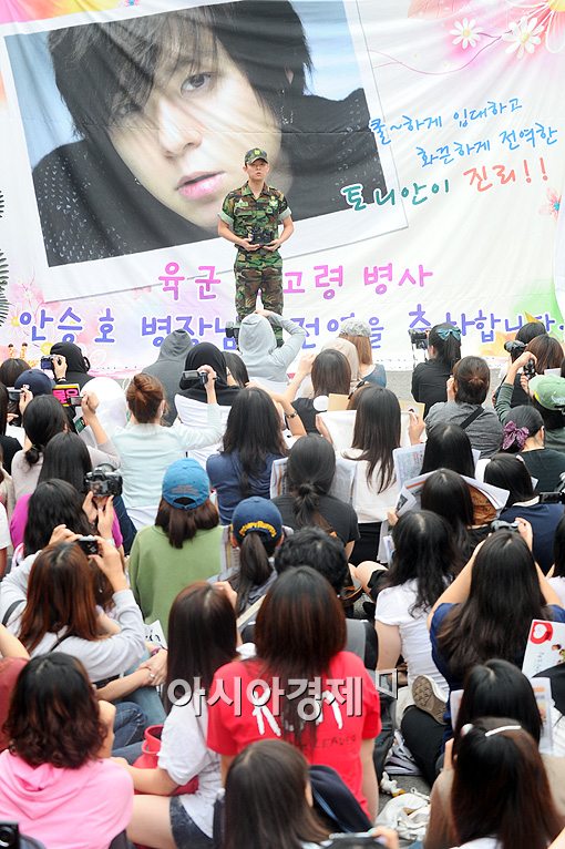 [스포츠투데이 이기범 기자]가수 토니안이 14일 오전 서울 용산 국방홍보원에서 군 복무를 마친 뒤 전역, 수많은 팬들이 마중 나와 그의 모습을 지켜보고 있다.