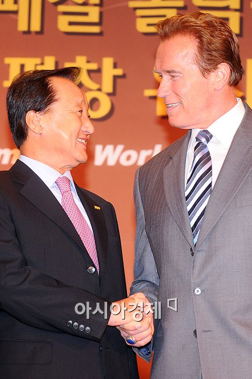 [스포츠투데이 이기범 기자]이광재 강원도지사(왼쪽)와 아놀드 슈왈제네거 미(美) 캘리포니아 주지사가 15일 오전 서울 홍은동 그랜드힐튼호텔에서 열린 '2013 스페셜 올림픽 세계동계대회 평창 유치 선포식'에서 악수를 나누고 있다.