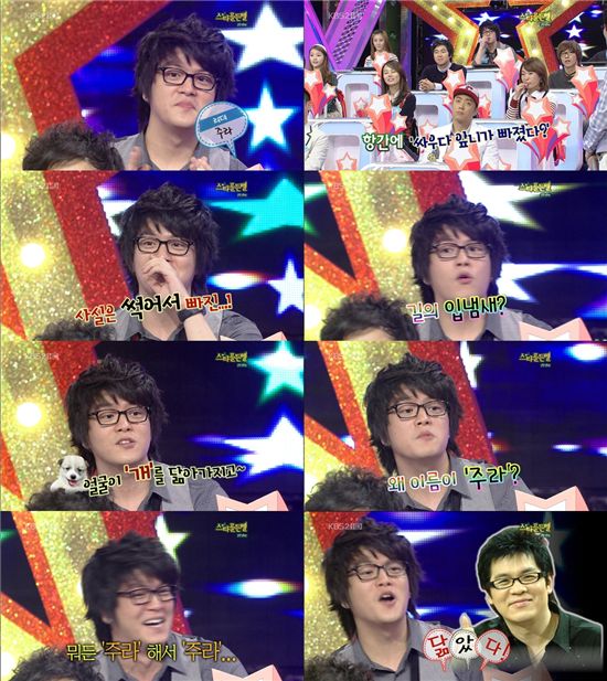 한편 주라는 “개리는 얼굴이 개와 닮아서 개리이고 내 이름은 무슨 물건을 보고 ‘이 것 좀 주라’라고 버릇처럼 말하다 보니 별명이 됐다”고 이름에 얽힌 사연을 밝혔다.