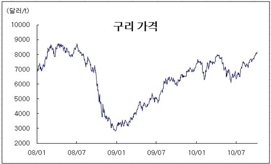 국제 구리 가격은 6월 연저점을 찍은 후 꾸준히 상승세를 유지해 2년전 사상최고치에 10% 이내로 근접한 상태다. 6일(현지시간) 뉴욕상품거래소(COMEX) 12월만기 구리는 파운드당 전일대비 2.65센트(0.71%) 오른 3.753달러로 지난 2008년 7월14일 이후 최고치에 올랐다. COMEX 구리의 사상최고가는 지난 2008년 7월초에 기록한 4.07달러다.