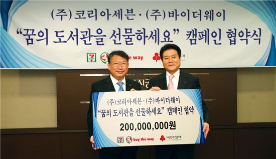 [아시아경제 오현길 기자]편의점 세븐일레븐과 바이더웨이는 사회복지공동모금회와 14일 '꿈의 도서관' 건립을 위한 협약식을 갖고 기금 2억원을 전달했다.