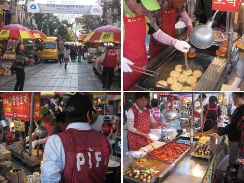 부산국제영화제 PIFF존이 있는 남포동 거리. 남포동 거리 상인들은 천막과 조끼에 'PIFF'마크를 새긴채 장사를 하고 있다. 영화제를 찾은 관광객들은 맛집이 즐비한 남포동을 찾아 볼거리와 먹거리를 동시에 만족하고 있다.