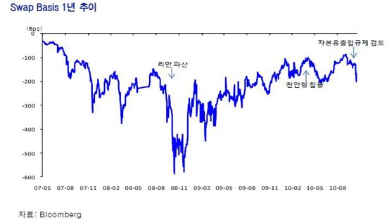 다만 리먼사태후 천안함사건에 따른 지정학 리스크 당시보다는 확대폭이 적다는 분석이다. 천안함 당시 1년 베이시스가 -213bp까지 확대됐다가 축소된 바 있다. 반면 계량적 관점에서는 면세폐지에 따른 외국인들의 기대손실 폭이 50bp 내외라는 점에서 이번 확대가 생각보다 크다는 지적이다. 김 애널리스트는 “재정거래를 목적으로 하는 외국인의 경우 현재 베이시스 레벨이 매력적이다. 외화 관련 규제가 추가로 더 강화될 것이라는 우려가 발생하지 않는 한 외인투자가 꾸준히 진행될 가능성이 크다”고 전망했다.