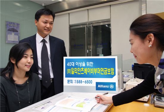 [아시아경제 박정원 기자] 알리안츠생명은 은퇴기에 접어든 베이비부머를 위한 전용 연금보험인 ‘무배당 알리안츠베이비부머연금보험’을 다음달 1일부터 판매한다고 28일 밝혔다.