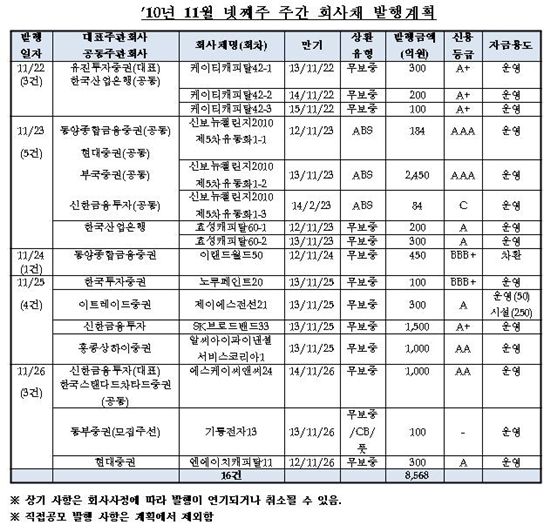 금융투자협회가 19일 발표한 ‘11월 넷째주(11월22~26일) 회사채 발행계획 집계 결과’에 따르면 신한금융투자가 대표주관하는 SK브로드밴드 33회차 1500억원을 비롯해 총 16건 8568억원의 회사채가 발행될 예정이다. 이는 이번주(11월15일~19일) 발행계획인 7건 6907억원에 비해 발행건수는 9건이, 발행금액은 1661억원 증가한 것이다.