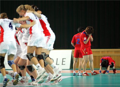 털썩 코트에 주저앉은 선수들. 아시아 무대서의 패배기에 아픔은 더 컸다. 핸드볼 한 관계자는 “선수 모두 이 같은 결과를 받아들일 준비를 하지 못했을 것”이라며 “국민들이 이들을 채찍 대신 당근으로 위로했으면 좋겠다”고 말했다.