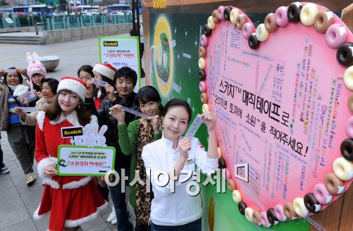 [아시아경제 이재문 기자]5일 오전 서울 광화문 청계광장에서 열린 '스카치™ 매직테이프 소원성취 이벤트'에서 홍보 도우미와 관광객들이 새해 소원을 적은 매직테이프를 들어보이고 있다.
