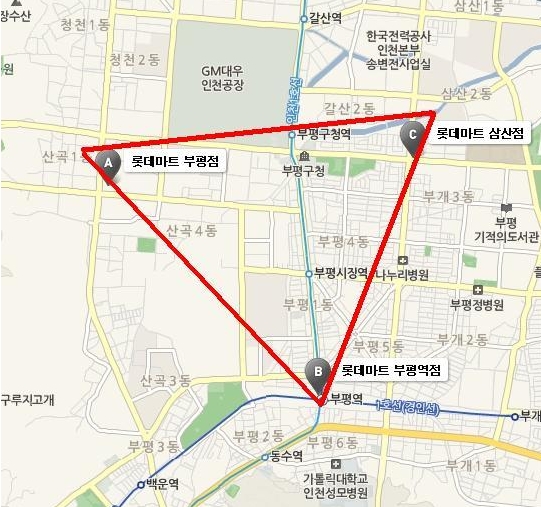'피자치킨 종결자'라는 이미지도 재밌다. 일산 화정역 인근 상권인데 반경 144미터 내에 이마트와 롯데마트가 함께 있어 이지역 피자와 치킨업종이 초토화될 것이라는 뜻이다. '버뮤닭 삼각지대'도 있는데 인천 부평지역 롯데마트 지점 세곳을 연결한 지도로, 이 지역내 치킨가게가 타격을 입을 것이라는 의미다.