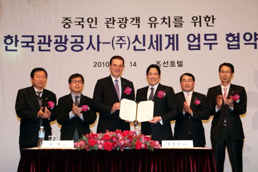 신세계는 14일 서울 소공동 조선호텔에서 정용진 신세계 대표와 이참 한국관광공사 사장이 참석한 가운데 전략적 제휴 협약식을 갖고 중국인을 대상으로 한 다양한 관광객 유치 프로모션을 진행키로 했다.