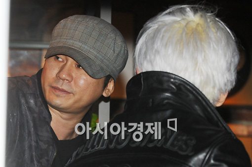 [스포츠투데이 이기범 기자]14일 오후 서울 영등포 타임스퀘어에서 열린 유닛 정규앨범 '지디 앤 탑(GD & TOP)' 월드프리미어 쇼케이스에 참석한 YG엔터테인머트 양현석 대표가 지드래곤, 탑과 대화를 나누고 있다.