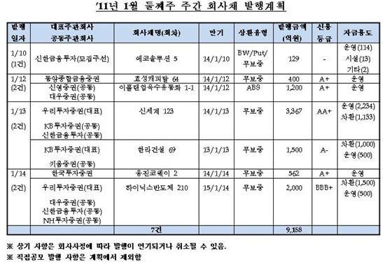 금융투자협회가 7일 발표한 ‘1월 둘째주(1월10일~14일) 회사채 발행계획 집계 결과’에 따르면 우리투자증권과 대우증권, 신한금융투자, NH투자증권이 공동주관하는 하이닉스반도체 210회차 2000억원을 비롯해 총 7건 9158억원의 회사채가 발행될 예정이다.
