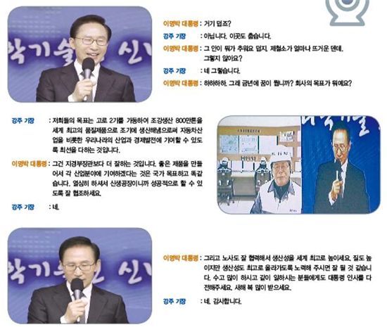 12일 현대제철은 이 대통령이 지난 7일 한국과학기술회관에서 열린 '2011 과학기술인 신년인사회' 자리에서 현대제철 당진제철소 강주(소결ㆍ소성부) 기장과의 화상통화를 통해 신년 안부를 전했다고 밝혔다.