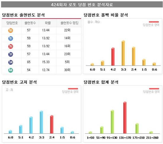 <424회 로또당첨번호 분석> 당첨번호 10, 11, 26, 31, 34, 44 보너스번호 30