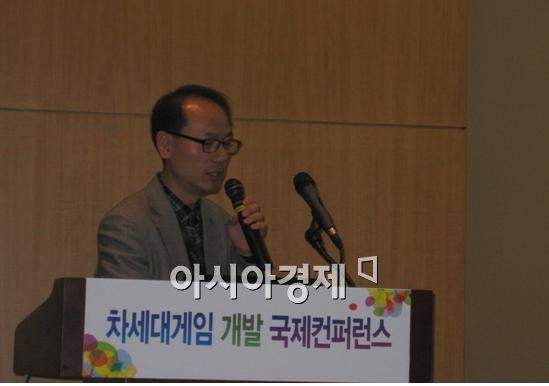 [스포츠투데이 강경록 기자]118일 오전 서울 강남구 코엑스에서 한국콘텐츠진흥원(원장 이재웅) 주최로 열린 '차세대게임 개발 국제컨퍼런스'에 두번째 강연자 한국전자통신연구원 박창준 선임연구원이 강연을 하고 있다.