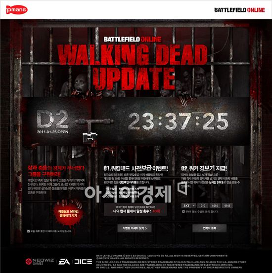 [스포츠투데이 전성호 기자]네오위즈게임즈는 일렉트로닉아츠(Electronic Arts Inc)와 공동 개발한 대규모 전장 FPS ‘배틀필드 온라인’에 업데이트될 신규 AI(인공지능)모드 ‘워킹데드’ 티저사이트를 공개한다고 18일 밝혔다.
