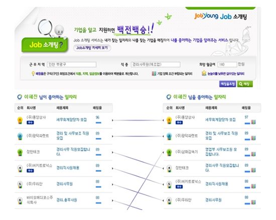 [아시아경제 김승미 기자]한국고용정보원(원장 정인수)은 대졸 취업전용 사이트 잡영(www.jobyoung.go.kr)에서 새로운 개념의 온라인 취업지원서비스 '잡 소개팅'을 제공한다고 19일 밝혔다.