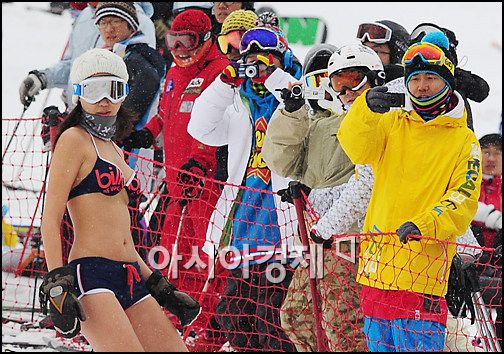 [무주(전북) = 스포츠투데이 박성기 기자] 22일 오전 11시 전라북도 무주군 설천면 무주리조트 만선 베이스 루키힐 슬로프에서 개최된 '2011 Mujuresort Bikini Ski Festival(2011 무주리조트 비키니 스키대회)'에서 모델이 설원을 질주하고 있다.