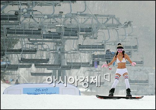 [무주(전북) = 스포츠투데이 박성기 기자] 22일 오전 11시 전라북도 무주군 설천면 무주리조트 만선 베이스 루키힐 슬로프에서 개최된 '2011 Mujuresort Bikini Ski Festival(2011 무주리조트 비키니 페스티벌)'에서 모델이 설원을 질주하고 있다.