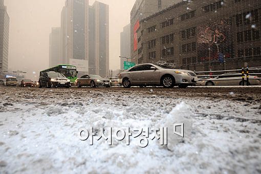 [아시아경제 윤동주 기자] 많은 눈이 내린 23일 제설작업이 제대로 이뤄지지 않아 내린 눈이 그대로 쌓인 도로위를 차량들이 조심스럽게 지나고 있다.
