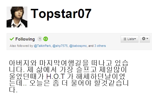 토니안은 이날 오전 자신의 트위터에 "아버지와 마지막 여행길을 떠나고 있습니다. 제 삶에서 가장 슬프고 제일많이 울었던 때가 H.O.T 가 해체하던 날이었는데.. 오늘은 좀 더 울어야 할것같습니다"는 글을 올려 팬들의 가슴을 아프게 했다.