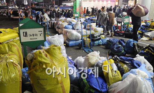 [아시아경제 이재문 기자]민족대명절인 설을 앞두고 재래시장이 명절특수에 반짝 호황을 누리고 있다. 28일 새벽 서울 동대문시장에 지방에서 올라온 상인들이 구입한 짐 보따리들이 시장바닥을 가득 메우고 있다. 최근 계속되는 경제한파에 서민들의 삶은 고단하지만 그래도 명절을 준비하는 손길에는 따뜻함이 느껴진다.