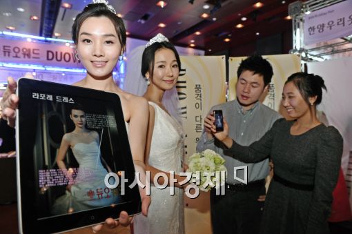 [아시아경제 이재문 기자]30일 오전 서울 광진구 쉐라톤워커힐호텔에서 열린 '듀오, 스마트 웨딩페어'에서 예비 신혼부부들이 태블릿 PC를 이용해 상품정보를 알아보고 있다. 국내에서 처음 선보인 '스마트 웨딩페어'는 스마트폰과 태블릿 PC를 이용해 QR 코드를 찍으면 비교 분석할 수 있는 인프라를 제공한다.