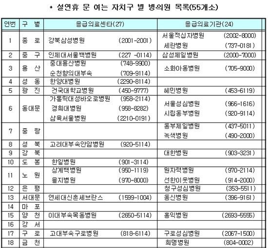 다음은 설 연휴동안 이용가능한 서울시내 응급의료기관 목록.