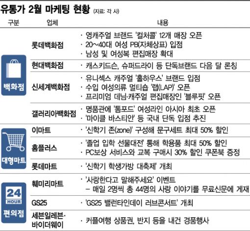 $pos="C";$title="유통가 표";$txt="";$size="510,471,0";$no="201102091103362781945A_1.jpg";@include $libDir . "/image_check.php";?>[아시아경제 이영규 기자]국내 유통가에 '2월 마케팅 대전'이 점화됐다. 백화점들은 새봄맞이를 위해 매장 차별화와 SPA(제조ㆍ유통 일괄화의류) 강화에 앞다퉈 나서고 있다. 그런가하면 대형마트들은 20여일 앞으로 다가온 봄 신학기를 겨냥한 마케팅전에 뛰어들었다. 이에 앞서 편의점 업계는 밸런타인데이(2월14일)를 앞두고 '통큰 마케팅'를 준비, 맞불작전을 펼치고 있다.