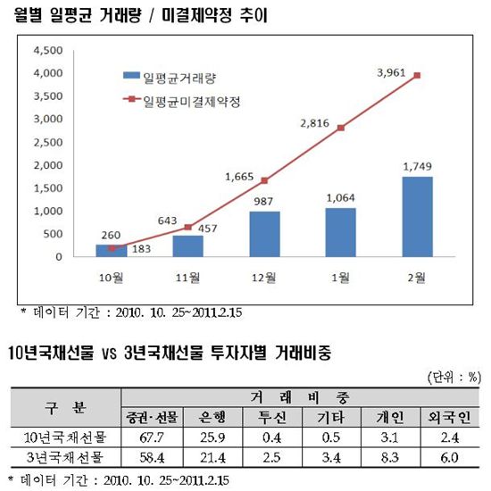 한국거래소가 16일 분석발표한 자료에 따르면 10년 국채선물 2월 현재 일평균거래량이 1749계약을 기록했다고 밝혔다. 이는 지난해 10월 260계약, 12월 987계약에서 지속적으로 증가추세를 보이고 있는셈이다. 미결제약정 또한 2월 현재 3961계약을 보였다. 이 또한 지난해 10월 183계약, 12월 1665계약에서 꾸준히 늘고 있는 흐름이다. 일일 최대거래량과 미결제약정수량은 각각 지난 9일 2919계약과 10일 4287계약이었다.