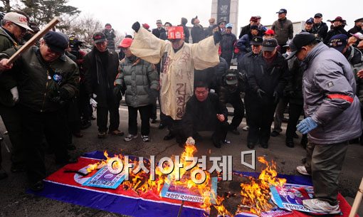 [아시아경제 윤동주 기자] 북한의 김정일 위원장의 70번째 생일인 16일 경기도 파주 임진각에서 반북단체 회원들이 '북한의 3대 세습 반대와 북한의 체제'를 비난하며 인공기와 김정일, 김정은 사진을 불태우고 있다.