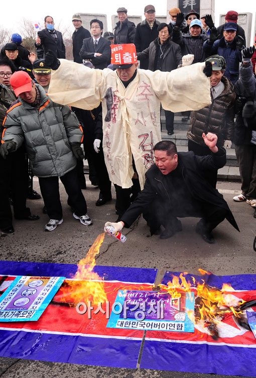 [아시아경제 윤동주 기자] 북한의 김정일 위원장의 70번째 생일인 16일 경기도 파주 임진각에서 반북단체 회원들이 '북한의 3대 세습 반대와 북한의 체제를 비난하며 인공기와 김정일, 김정은 사진을 불태우고 있다.