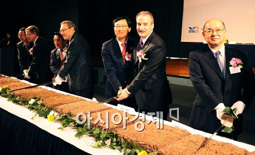 행사에 참석한 최중경 지식경제부 장관과 주요인사들이 최근 10년간 최대 실적인 130억불의 외국인투자 탈성을 축하는 '외국인투자기업 동반성장 선언문'을 채택한후 기념 떡 컷팅식을 하고 있다.