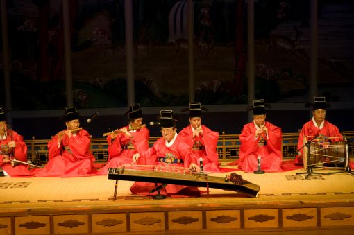제과전문그룹 크라운-해태제과와 양주풍류악회 주최로 17일부터 이틀간 국립국악원 우면당에서 열리는 ‘제4회 대보름 명인전’ 에서 중요무형문화재 제5호 판소리고법 이수자 김정수(장구), 중요무형문화재 제57호 경기민요 전수조교 박용호(대금), 정재국(피리) 명인 등 양주풍류악회 명인 9인이 ‘수제천’을 연주하고 있다.