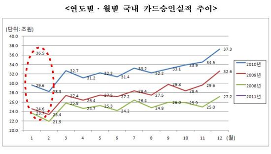 1월 카드사용액 36.5조..전년비 23.1% ↑