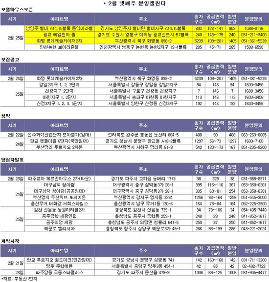 19일 부동산정보업체 부동산1번지에 따르면, 2월 넷째 주에는 전국 3개 사업장에서 임대아파트를 포함해 1872가구가 일반에 공급될 예정이다. 당첨자발표는 8곳, 계약은 3곳에서 진행된다. 견본주택 4곳도 문을 연다.