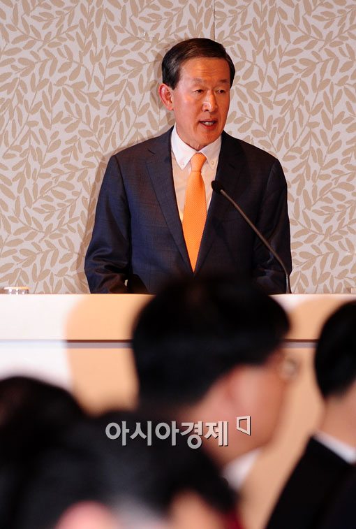 [아시아경제 윤동주 기자] 24일 서울 플라자호텔에서 열린 전경련 회장단 정기총회에서 33대 전경련 회장으로 추대된 허창수 신임 전경련 회장이 취임사를 하고 .
