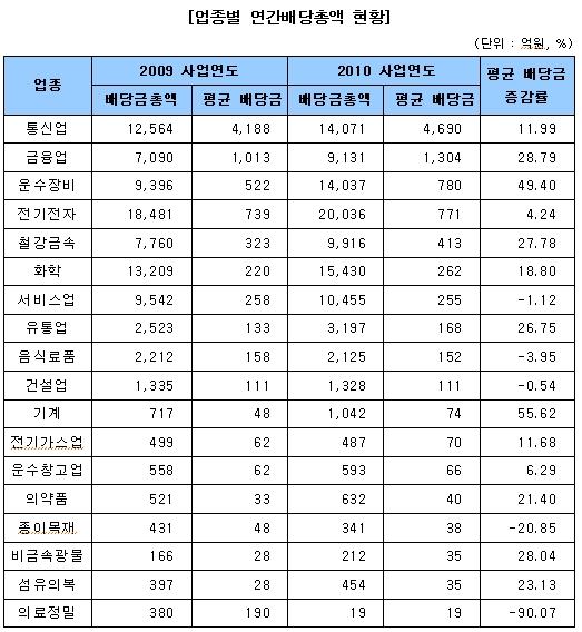 업종별 배당금총액은 삼성전자가 속한 전기전자가 2조36억원으로 가장 많았지만 업종별 1개 기업당 평균배당금총액은 통신업이 4690억원으로 1위였다.