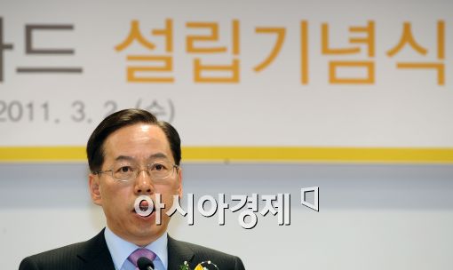 [아시아경제 이재문 기자]2일 오전 서울 내수동 KB국민카드빌딩에서 열린 설립기념식에서 최기의 KB국민카드 사장이 기념사를 하고 있다.