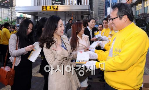 [아시아경제 이재문 기자]2일 오전 서울 중구 을지로입구역에서 KB국민카드 직원들이 시민들에게 '0세부터 100세까지 국민님, 힘내세요!'라는 제목의 책을 나눠주고 있다.